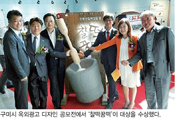 구미시는 지난 1일 구미시립중앙도서관에서 '제1회 구미시 옥외광고 디자인 공모전' 시상식을 열었다. 이번 옥외광고 디자인 공모전에는 총 117점의 작품이 접수돼 경쟁했다. 이 가운데 구미 현대광고자재 주동휘 대표의 '찰떡쿵떡'이 영예의 대상을 받았으며 금상은 윤다민(구미 옥계초교)`김수빈(경운대) 씨 등이 각각 차지했다. 입선 작품은 지난 7일까지 구미시립중앙도서관 로비에 전시됐다. 이묵 구미 부시장은 "공모전을 통해 우수한 창작품이 많이 발굴돼 아름다운 도시경관을 돕고 옥외광고산업 발전이 이뤄지길 바란다"고 말했다.