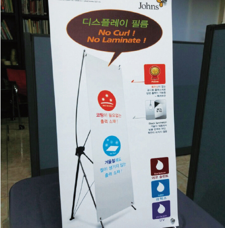 존스미디어에서 디스플레이 필름이 시장에서 주목받고 있다. 이 제품은 사계절 동안 컬(휨)현상이 없고 코팅이 필요 없는 광고 출력 소재다. 독자적으로 개발한 다층 구조의 특허 제품으로 합지 시에 블록아웃 기능을 부여하여 빛을 완벽하게 차단할 뿐만 아니라 원단의 탄력, 완벽한 Flatness, 뛰어난 내구성을 지닌 Roll up, Pop up에 최적화된 제품이다. 수성 타입과 에코솔벤트 타입으로 각각 나뉘고(라텍스 및 UV 프린터 적용), 양면 출력이 가능해 전시장이나 매장 디스플레이 등 각종 광고 출력소재로 각광받고 있다. ●문의: 063-461-6281 www.johnsmedia.co.kr