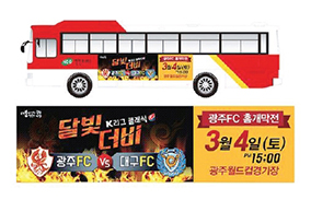 광주광역시를 연고로 하는 프로축구팀인 ‘광주FC’가 옥외광고를 활용한 집중 홍보에 나서 눈길을 끈다. 광주FC는 2월 13일부터 시즌 종료 시까지 옥외광고를 연간 운영할 방침인 것으로 알려졌다. 광주FC가 선택한 옥외광고 매체로는 시내버스, 지하철, 대형 전광판 등이며 광주지역 5개구를 대상으로 펼쳐진다. 광주FC는 옥외광고를 통해 홈경기 일정 및 소식을 시민들에게 적극 알림과 동시에 구단 후원사들을 노출시켜 홍보 효과를 극대화한다는 방침이다.