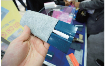 디자인헤라가 최근에 선보인 롤링 융헤라는 기존의 융헤라에서 융이 쉽게 닳아서 불편했던 부분을 개선한 제품이다. 융헤라는 시트 부착 작업시 시트의 스크레치를 방지하고 헤라가 부드럽게 밀릴 수 있도록 헤라의 날 부분에 부드러운 천소재를 부착한 제품이다. 일반 플라스틱이나, 고무헤라의 경우 경도가 약한 시트를 작업할 경우 시트 표면이 긁히는 경우가 있어, 많은 작업자들이 융헤라를 선호한다. 하지만 기존 융헤라의 경우 작업에 따른 마찰이 집중되는 날 부분의 천만 빠르게 닳게 된다. 따라서 작업도중 예상치 못하게 천이 닳아 찢어져 낭패를 보는 경우도 종종 발생한다. 롤링 융헤라는 기존 제품과 달리 날 부분에만 천을 입히는게 아니라 헤라 전체를 천커버로 두른 제품이다. 또한 헤라의 중심부에 딱맞춰진 천커버를 돌릴 수 있는 롤러장치가 내장돼 천커버를 돌리면서 사용할 수 있게 했다. 즉 날 부분의 천이 닳으면 롤러를 돌려서 닳지 않은 부분의 천을 사용하면 된다.