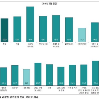 침체 벗어나 음료·서비스·건설업종 위주 활기한국방송광고진흥공사(코바코)는 5월 종합 광고경기 예측지수(KAI)가 전달보다 다소 증가한 120.9로 나타났다고 지난...