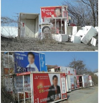 지난 4월 1일 파주시 인근의 한 야산. 2014년 열렸던 6.4 지방 선거에서 사용된 후보자들의 유세 차량용 래핑 제작물이 쓰레기로 방치된 모습. 하루빨리 정리...