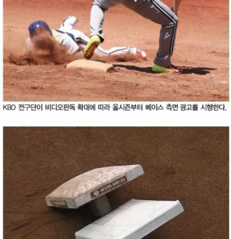 KBO “비디오판독 확대 따라 광고 효용성 있다” 판단 올시즌부터 광고자리 있는 신형 베이스로 전구단 교체올시즌부터 프로야구 경기장 베이스에도 광고가 허용된다. ...