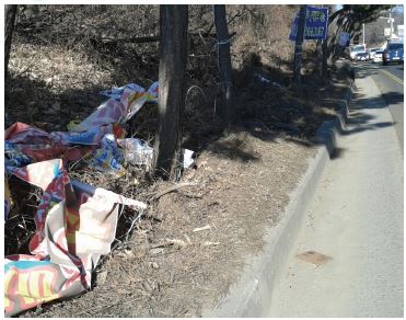 지난 2월 19일 김포시 국도변. 폐현수막이 엉망으로 널브러져 있는 모습이다. 바람이 많이 불 경우 폐현수막들이 차도 안쪽으로 날아 들어올 가능성이 높아 교통사고가 염려된다.