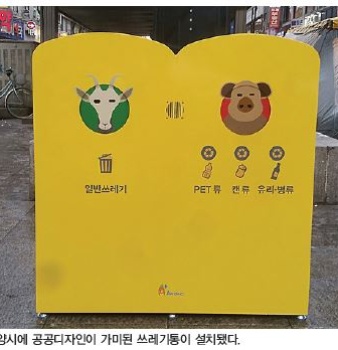 경기 안양시는 공공디자인이 가미된 쓰레기통을 안양1번가, 범계역과 평촌역 일대 등 3개소에 설치했다.노랑색상의 쓰레기통은 일반쓰레기와 재활용을 각각 분리해 투여할...
