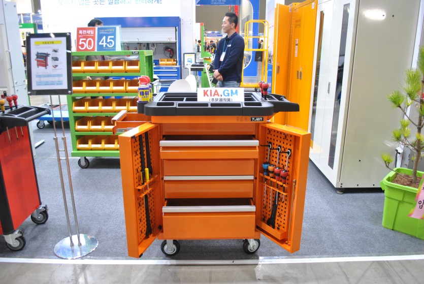 태진이엔지는 많은 공구를 한번에 이동할 수 있는 이동식공구함 ‘KIA,GM’을 출시했다. 물품 수납이 용이해 운반용 대차로 활용가능하고, 상부에는 여러 공구를 보관할 수 있는 정리함을 설치했다. 서랍의 열고 닫음이 원활하고, 서랍 내부의 공간 활용을 극대화 할 수 있도록 3중 레일을 설치했다. 서랍 손잡이는 알루미늄바로 감싸 단단하게 만들었으며, 디자인이 깔끔하고 세련되다. 서랍전면이 제품의 외곽으로 돌출되지 않아 안전하게 사용할 수 있다. 서랍 전면에 개별 잠금장치를 설치해 공구함 이동시 서랍이 빠져나오지 않도록 했다. 또한 전면부 서랍에는 도어를 설치했는데, 이 도어에 자주 쓰는 공구들을 걸어놔 작업자가 편리하게 사용할 수 있도록 했다. 제품은 사용자의 니즈에 따라 주문제작할 수 있다.