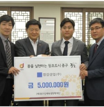 장학기금 전달 후, 최창식 중구청장(왼쪽 두 번째)이 창강온앤오프 안용배 대표(오른쪽 두 번째), 김운철 상무(오른쪽 끝), 김종헌 팀장(왼쪽 끝)과 함께 기념촬...