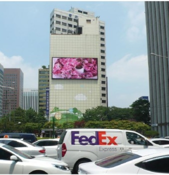 창강온앤오프가 을지로입구역 인근 자사 빌딩 외벽에 설치한 18×8m 규모 LED전광판. 위치 특성상 보행자 가독력이 탁월하며, 평균 속도 15km의 차량 정체 구...