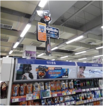 홈플러스를 찾는 소비자들의 동선에 맞춰 촘촘하게 ‘질레트 프로글라이드 플렉스볼’ 광고가 게첨된 모습. 전국 48개 점포에서 고객동선에 맞춰 촘촘한 매체 집행 외벽...