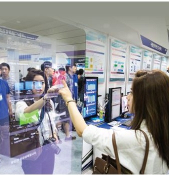 부산대 사물인터넷 연구센터가 출품한 스마트 미러를 본지 김정은 기자가 시연하고 있다. 스마트 미러는 사용자의 건강 측정은 물론, 프로그래밍에 따라 광고 송출도 가...