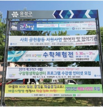 대전 유성구 노은네거리에 설치된 비영리 공공성 현수막 게시대 사진. ‘암묵적으로 용인한 공공성 불법현수막 이제 그만!’전국 최초 비영리 공공성 현수막 전용게시대 ...