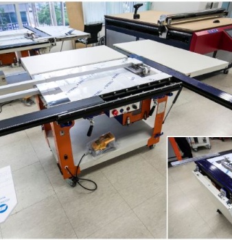 미래LNS가 새롭게 선보인 아크릴 재단기 ‘MR-A3200SR’. 보조테이블을 펼친 모습. 보조 테이블을 펼치면 트랜스포머처럼 1,200mm×2,400mm의 아크...