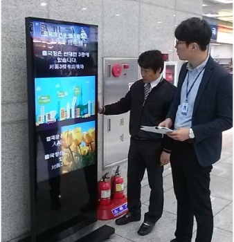 제1국제여객터미널에 새롭게 설치된 무인 정보안내시스템 키오스크를 이용하고 있는 방문객의 모습.인천항 제1국제여객터미널 입구의 안내사인물 교체 전(왼쪽), 후 사진...