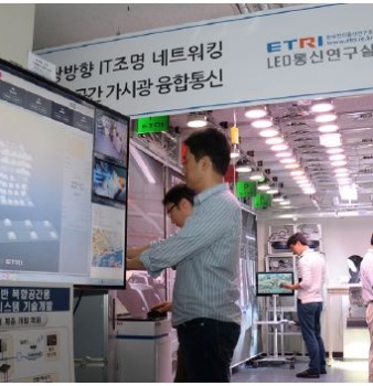 ETRI 연구진이 가시광무선통신 네크워킹 기술을 시연하고 있다.가시광무선통신(VLC) 네트워킹 기술개발 성공빛을 이용해 통신하는 시대가 열린다.한국전자통신연구원(...